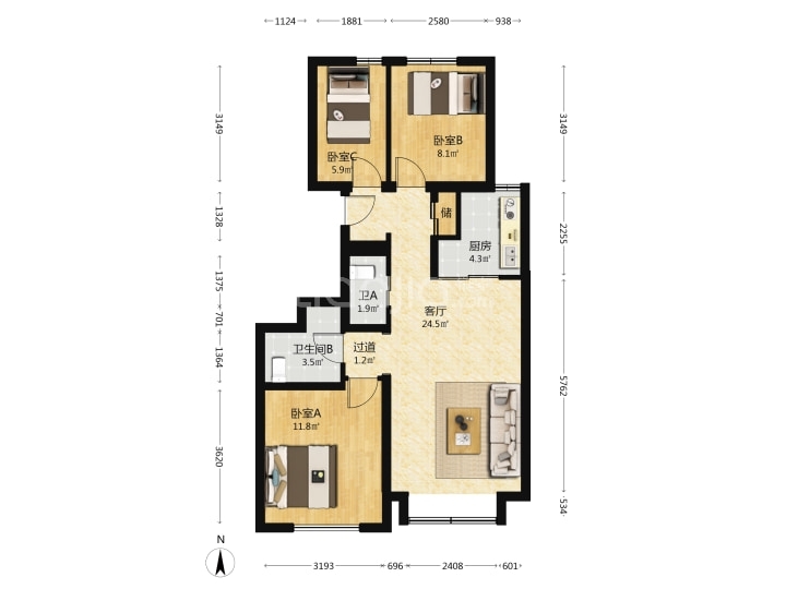 99㎡三室两厅全新精装房