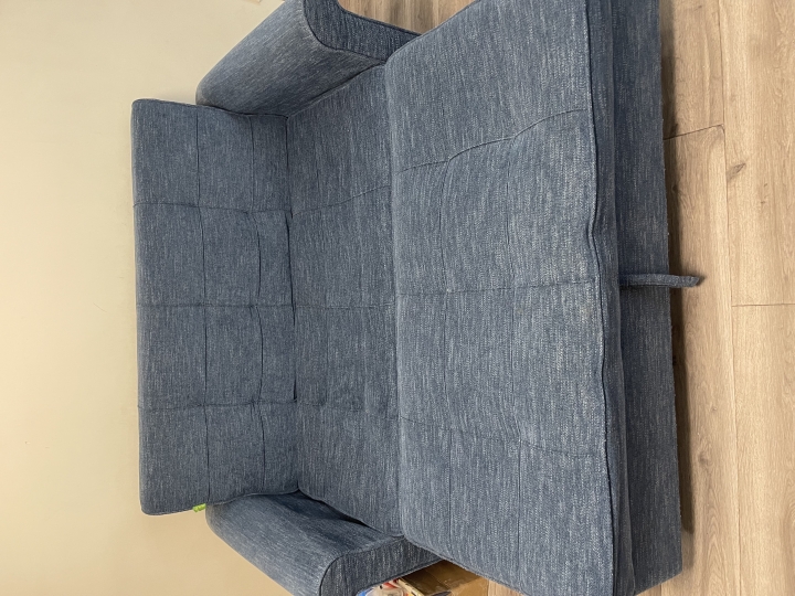蓝色沙发床,功能正常,拉开床垫微塌陷。尺寸长160cm,宽85cm