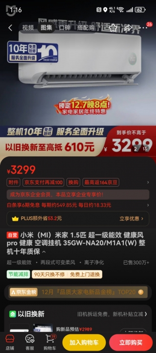 小米1.5匹健康风pro空调,今年9月份刚买的,用不超过15次(有app记录)配件...
